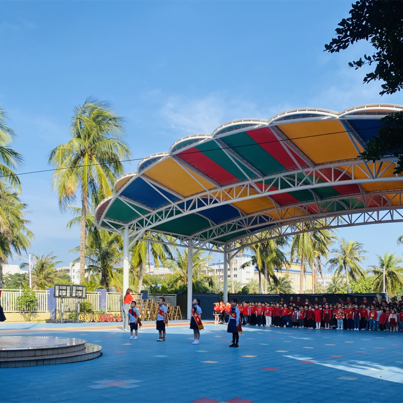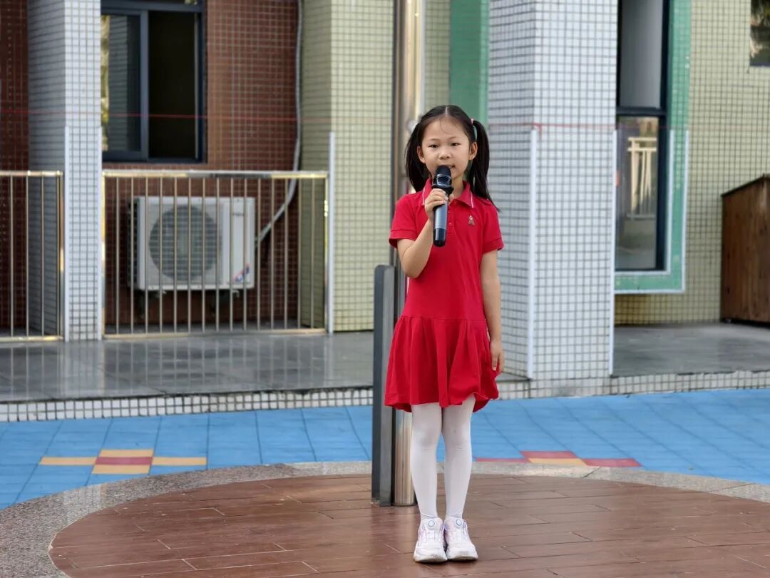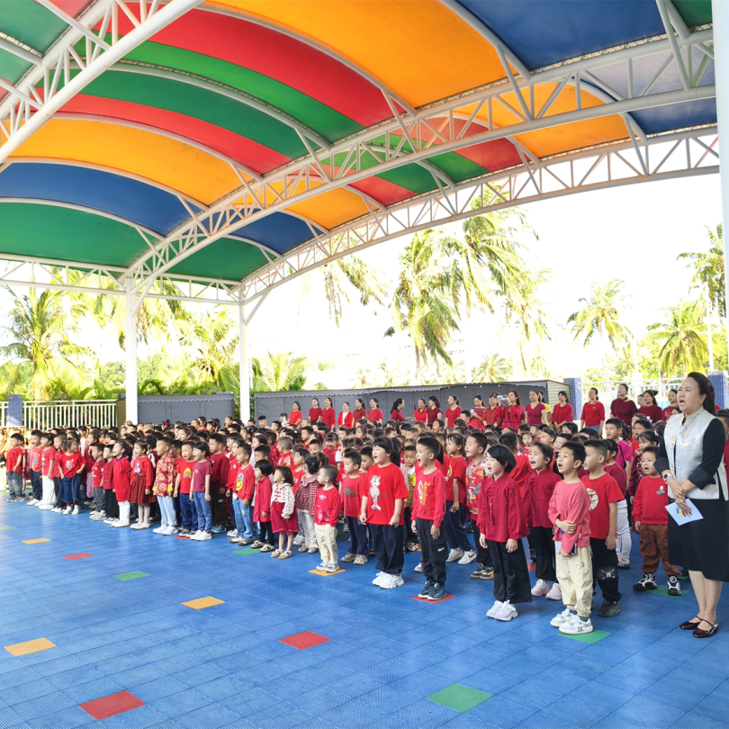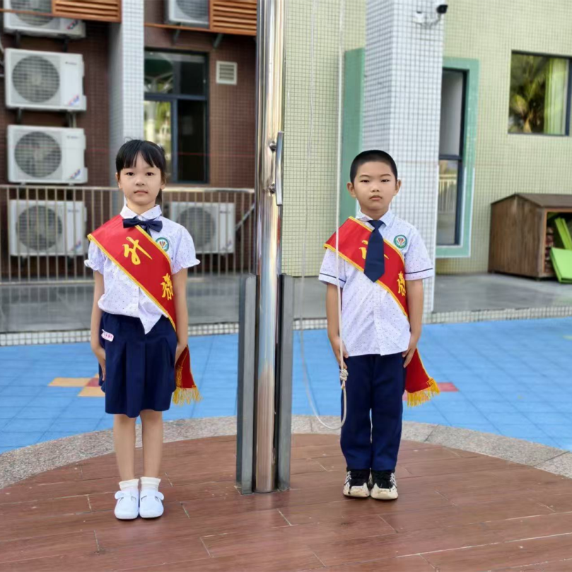 清晨的阳光洒满操场,全体师幼齐聚一堂,开学典礼在庄严的升旗仪式中拉开帷幕。国旗护卫队的小宝贝们迈着铿锵的步伐,护送国旗走向旗杆,雄壮的国歌声中,五星红旗冉冉升起,孩子们肃立注目,小小的胸膛里满是对祖国的热爱与敬意,这是新学期最庄重的开篇。