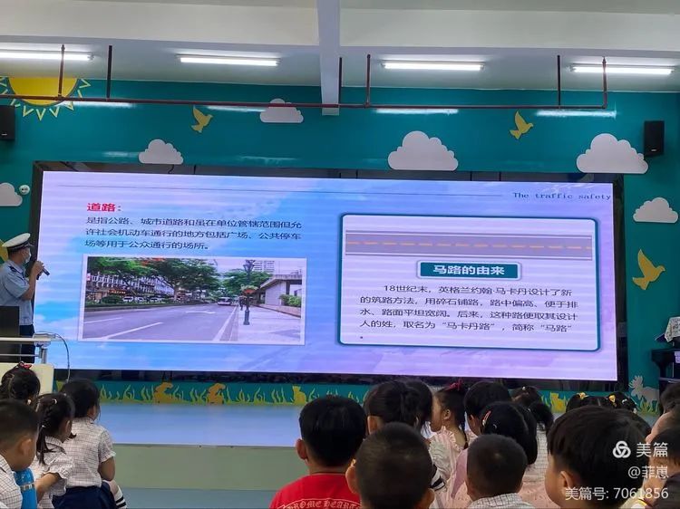 活动中,交警叔叔根据幼儿的年龄特点及接受能力,用通俗易懂的语言结合幻灯片、交通安全动画片、手势演练、知识问答等形式深入浅出地向孩子们宣传了一些交通安全知识。