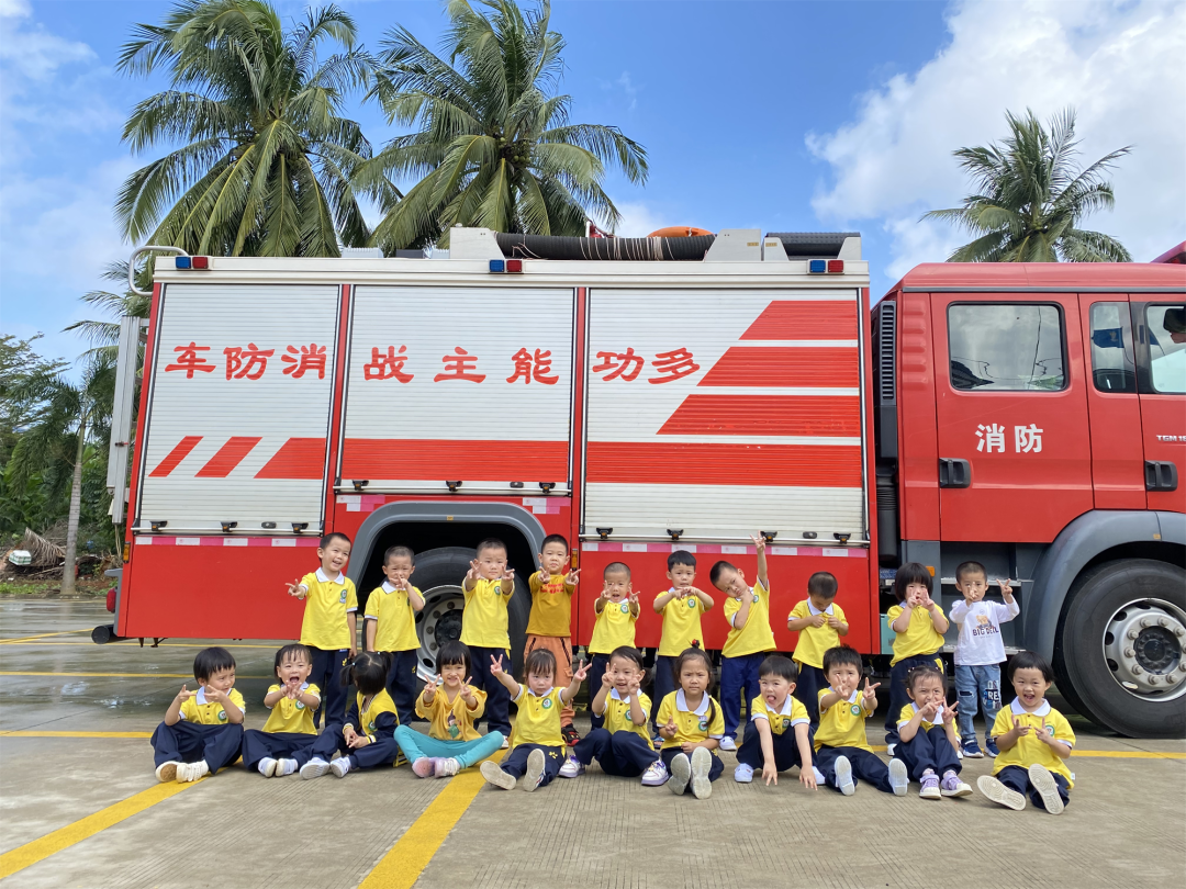 小朋友们和消防车一起合影留念,并期待下一次消防车和消防员叔叔的到来!