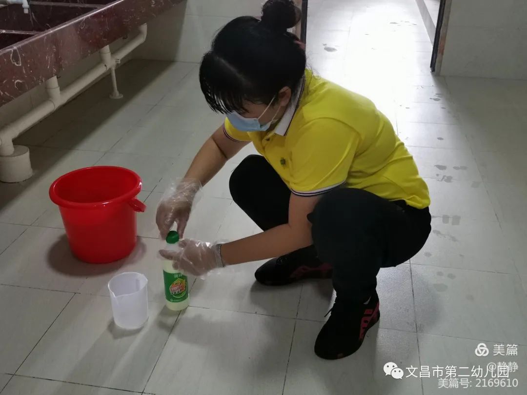 患病幼儿离园后,保健员及时更换防护装备,前往该患病幼儿的班级进行指导消毒。