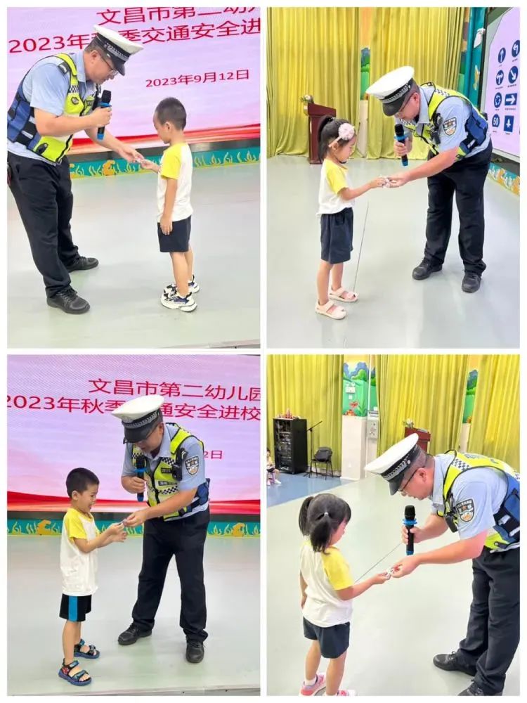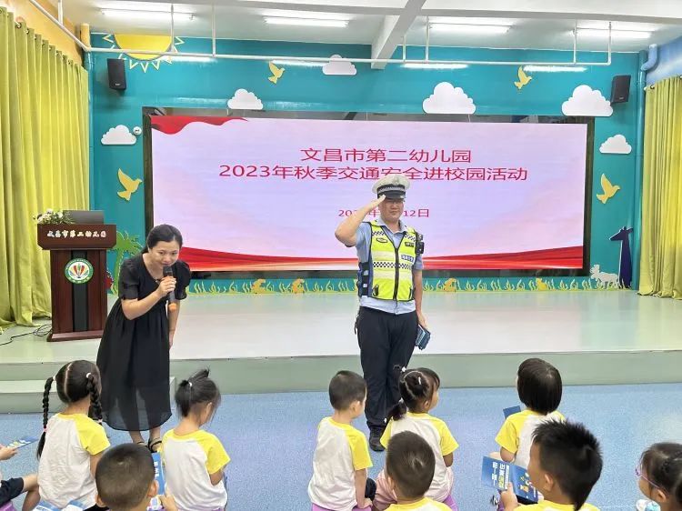 为进一步增强全园师生的交通安全意识,提高自我防范能力,规范安全出行行为,有效预防和减少道路交通事故的发生,确保师生交通安全。9月12日下午,文昌市第二幼儿园邀请文昌市公安局交警大队文城中队张其盛警官为小朋友们开展了“知危险,会避险”交通安全知识宣讲。
