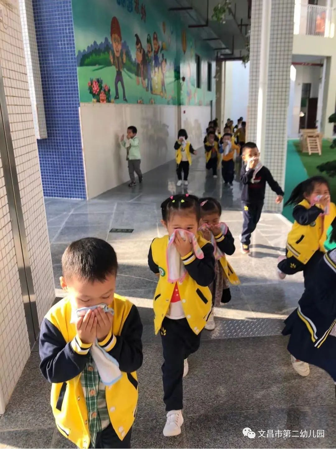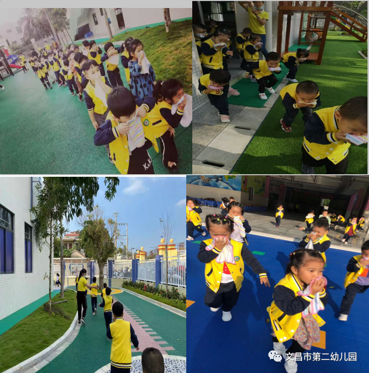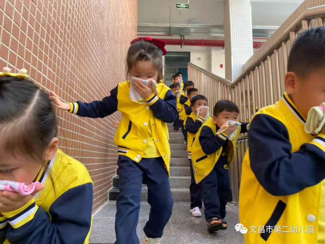 随着消防警报声的响起,全园教职工立即停下手中的工作,各楼层及安全疏散员就位,各班老师迅速按照紧急预案的疏散线路带领幼儿拿起湿毛巾,捂住口鼻,弯腰小步快速的撤离教室。