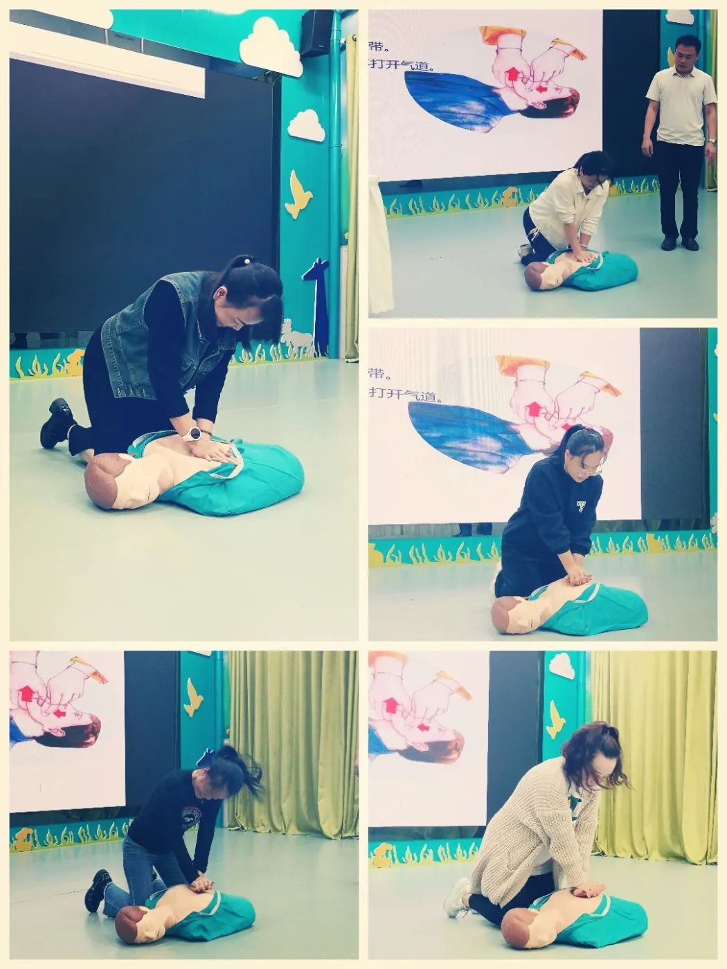 本次培训内容分为理论讲解和实践操作两部分,首先,通过PPT图文并茂地向老师们讲解了怎样正确的做“心肺复苏”,重点讲述发生紧急情况时如何处理,并通过现场实操给教职工们演示了应对急救的方法。