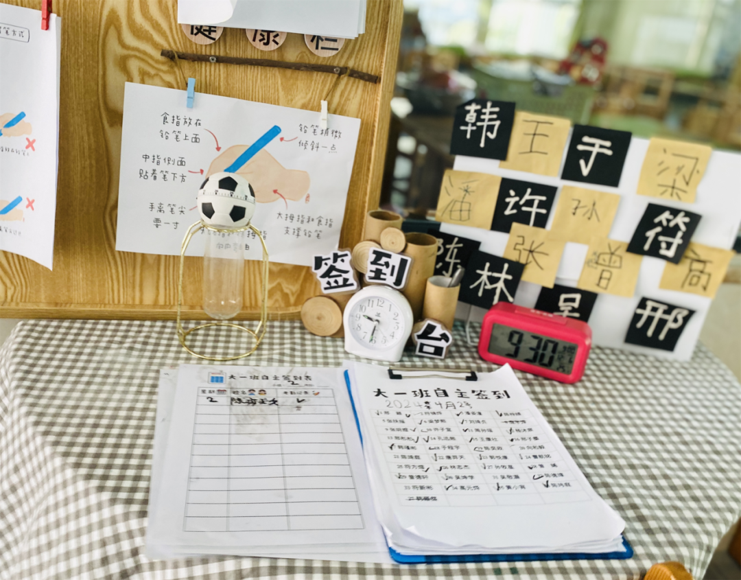大班年级科学聚焦幼小衔接,在签到环节中贯穿了时间、前书写等的能力培养。通过签到潜移默化的培养幼儿时间管理、自我管理、前书写等方面的习惯。
