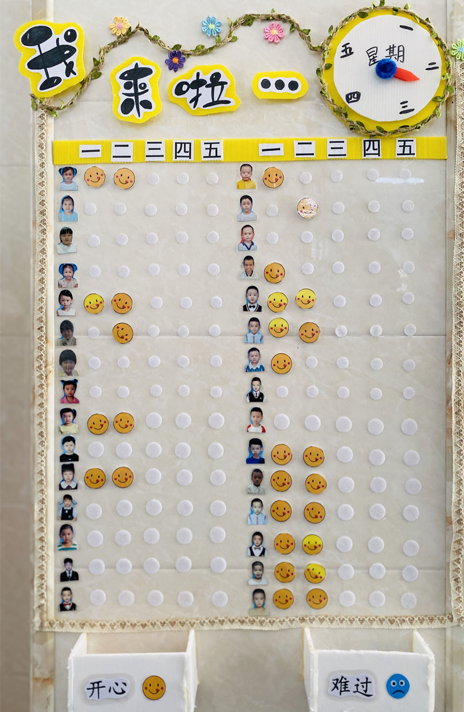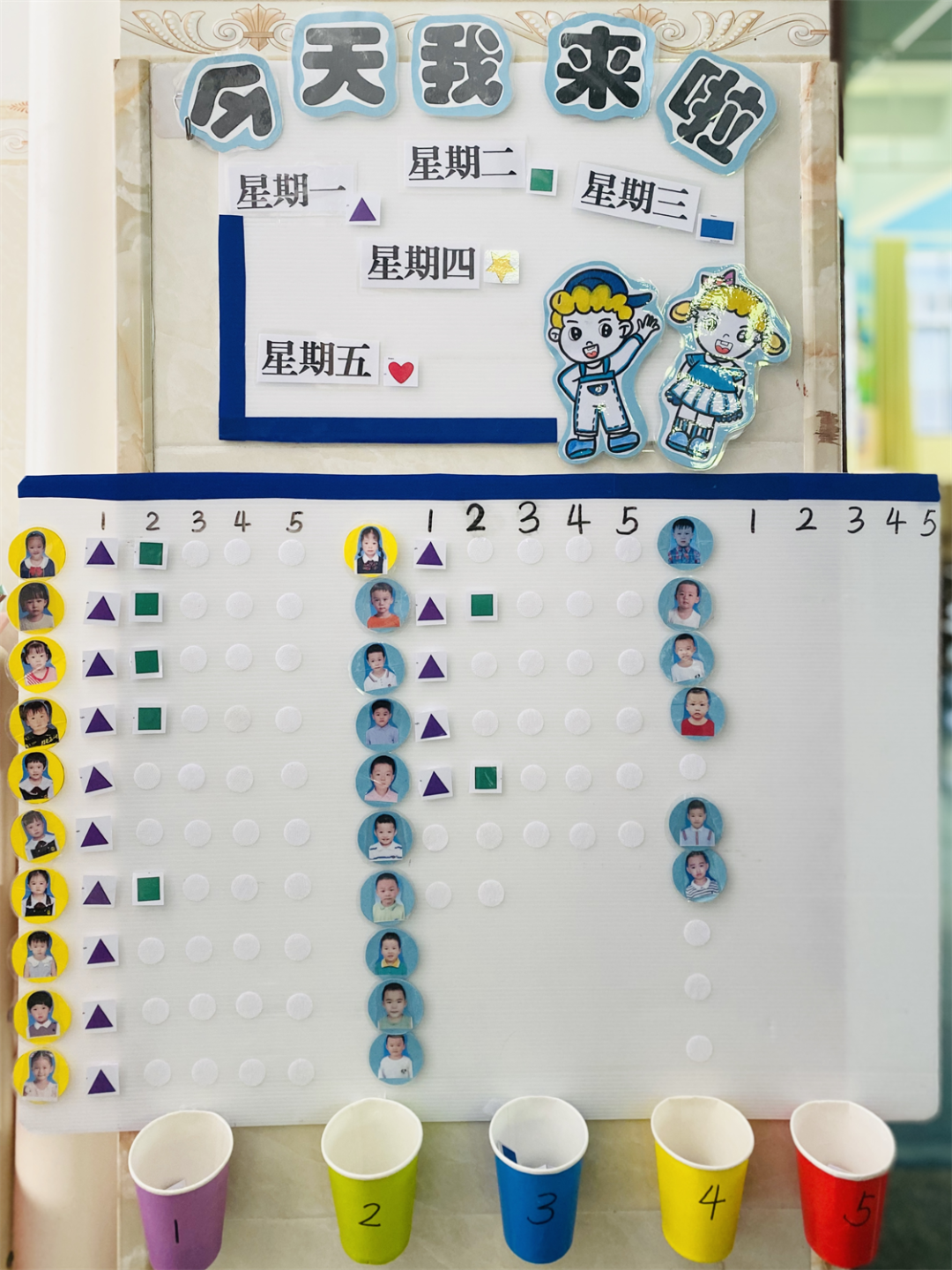 💕黄梦君:小一班签到情况大部分的幼儿目前都能够很喜欢的参与到签到活动,并积极的签到,但仍然也有个别幼儿需要提醒。设计目标:我们班级目前签到台设置了各种图形、数字、颜色,目的想给孩子从中起到一定的数学隐性教育作用。